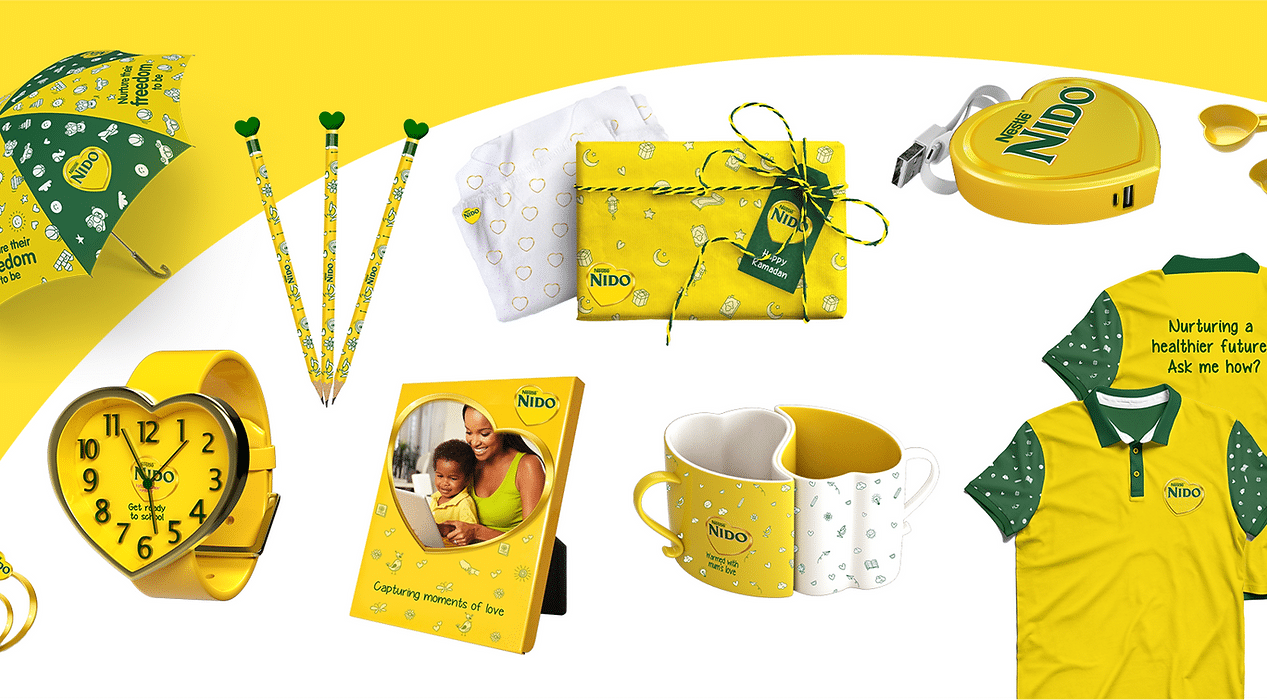 The Nido heart and colors ensured parents could instantly trace the products to the brand, reinforcing brand identity through merchandise.